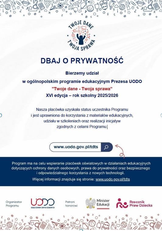 Dołączyliśmy do ogólnopolskiego programu edukacyjnego pn. „Twoje dane -Twoja sprawa”, którego organizatorem jest Urząd Ochrony Danych Osobowych. Warto zaznaczyć, że patronat honorowy nad programem objęli Minister Edukacji oraz Rzecznik Praw Dziecka. Tematem tegorocznej XVI edycji projektu będzie ochrona danych osobowych w kontekście rozwoju nowych technologii, ze szczególnym uwzględnieniem sztucznej inteligencji.