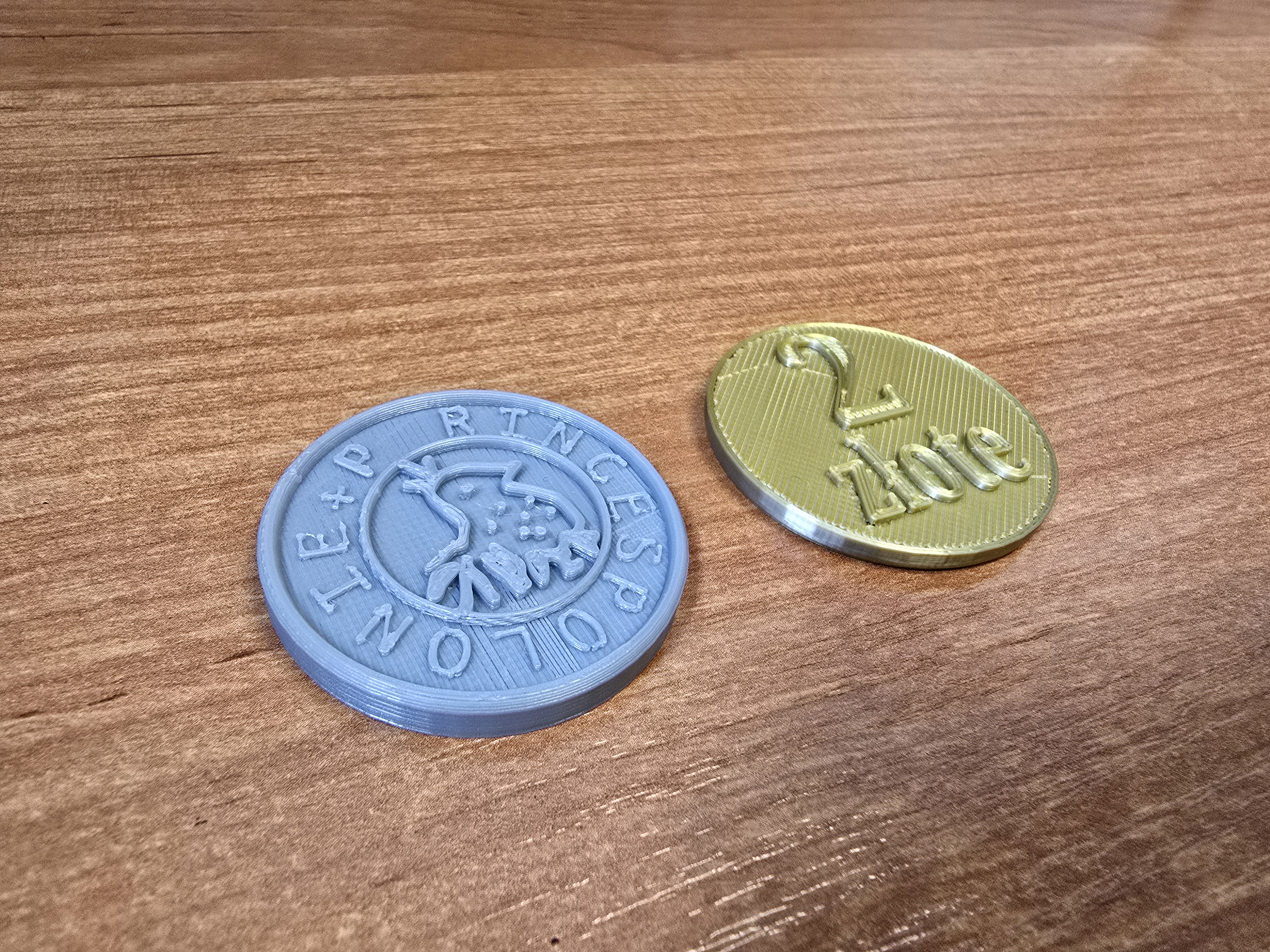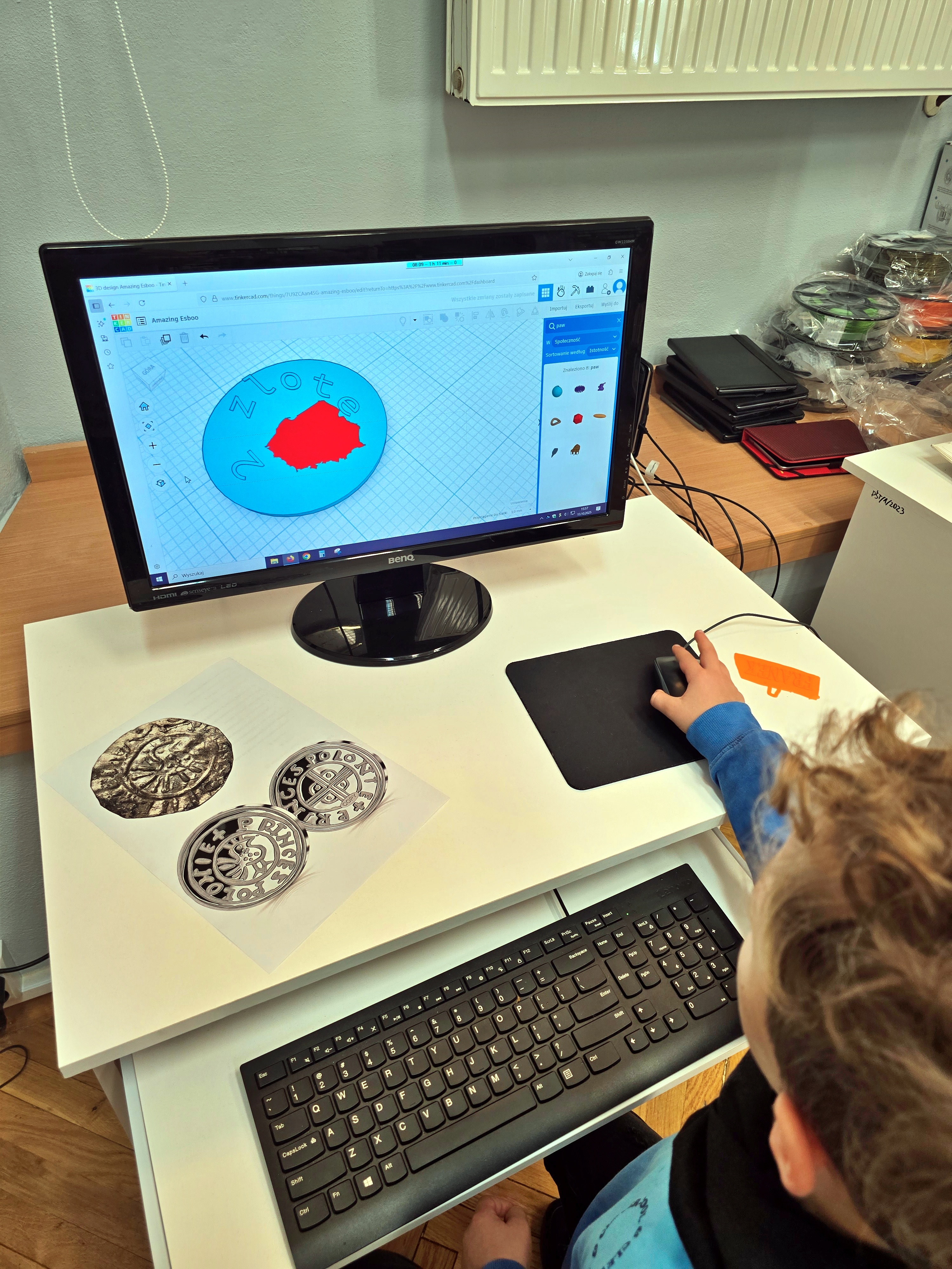 Część praktyczna poświęcona była projektowaniu i drukowi 3D. Uczestnicy poznali proces przygotowania modeli do wydruku oraz elementy niezbędne do tworzenia trójwymiarowych obiektów. Z dużym skupieniem odwzorowywali detale monet w programach projektowych, co okazało się sporym wyzwaniem przy pierwszym kontakcie z drukiem 3D. Na drugich zajęciach dzieci dopracowywały własne projekty monet z autorskimi symbolami, napisami i wzorami, przygotowując je do późniejszego wydruku.