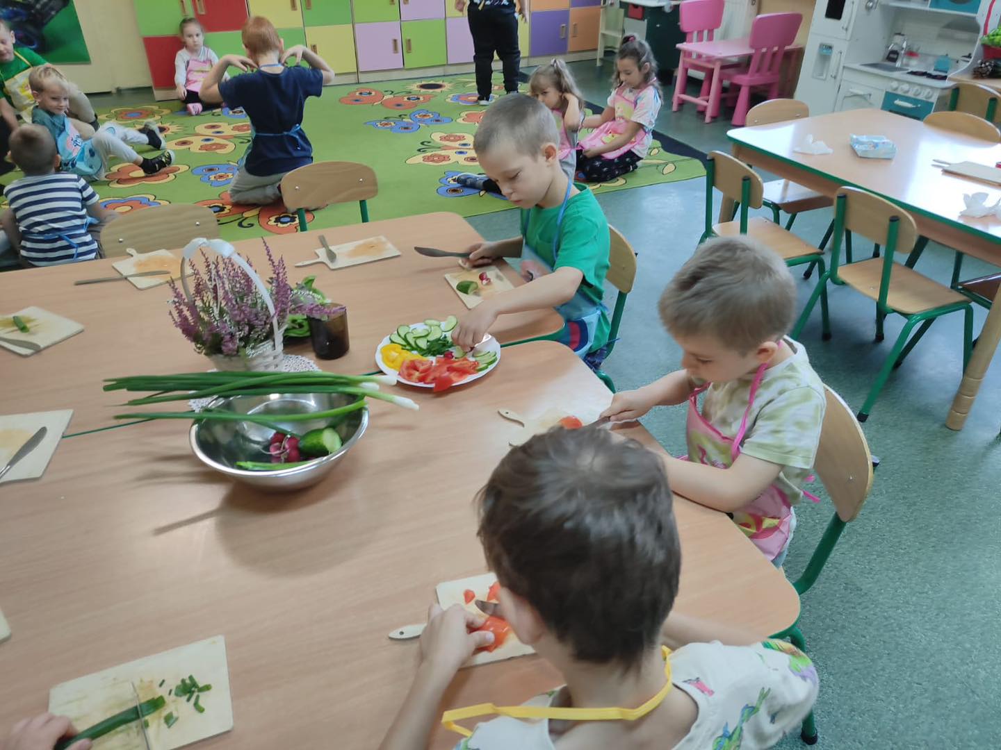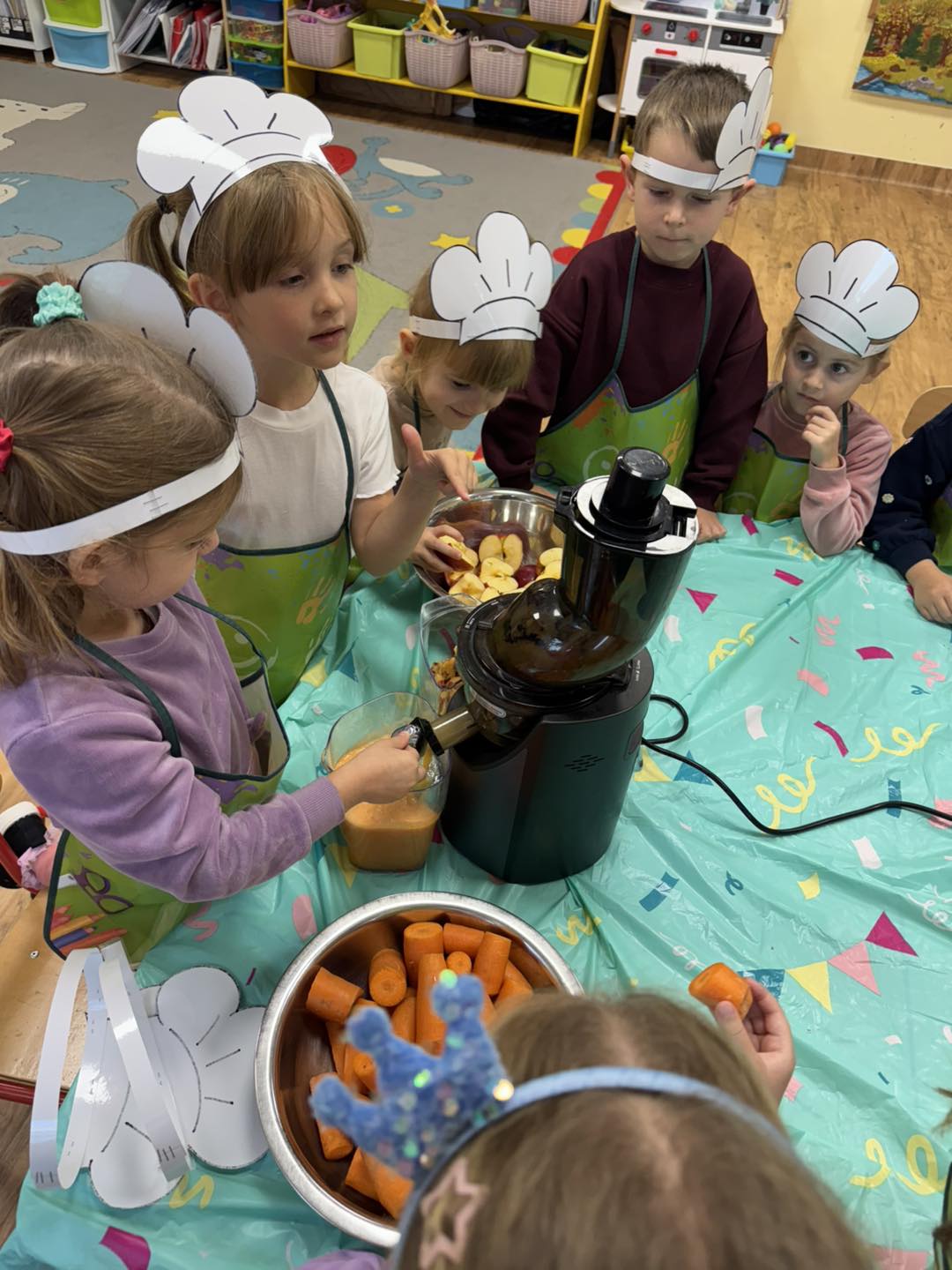 Dzieci 6- letnie wzięły aktywny udział w warsztatach kulinarnych. Samodzielnie komponowały kanapki z warzyw według własnego uznania. Były kolorowe i pyszne! Natomiast 5-latki przygotowały pyszny, zdrowy sok jabłkowo-marchewkowy.