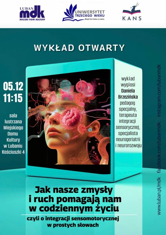 5 grudnia o godzinie 11:15 w Sali Lustrzanej Miejskiego Domu Kultury w Lubaniu odbędzie się otwarty wykład poświęcony roli zmysłów i ruchu w codziennym funkcjonowaniu człowieka. Spotkanie zostało zorganizowane w ramach działalności Uniwersytetu Trzeciego Wieku.